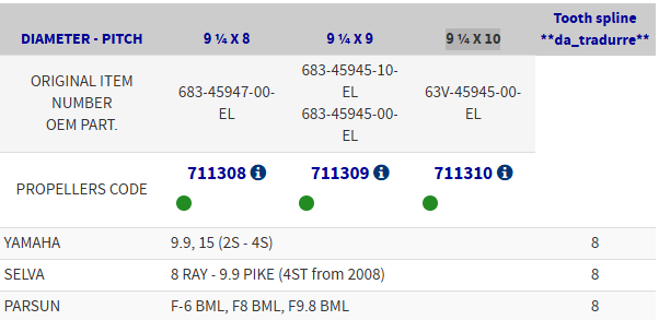- Numar caneluri : 8 potrivit si pentru motoare : Selva 8 RAY - 9.9 PIKE 4 TIMPI potrivit si pentru motoare : Parsun F-6 BML, F8 BML, F9.8 BM