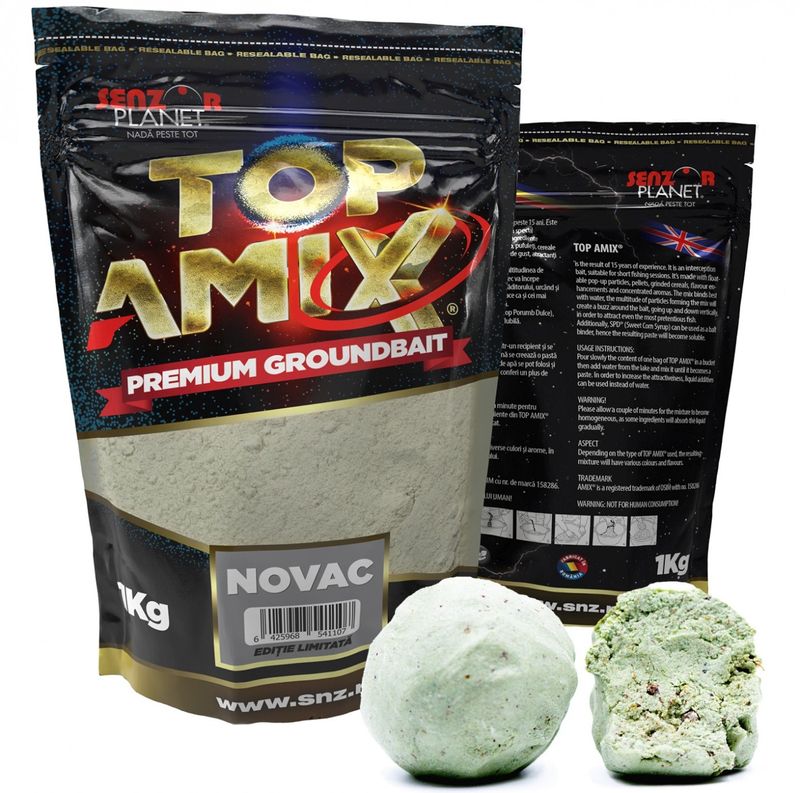 Top Amix Novac este un groundbait cu granulatie fina special conceput pentru pescuitul la fitofag. Se dizolva rapid, particulele mici plutesc mult timp si formeaza un nor permanent ce atrage ca un magnet pestii pe vadul nadit. Contine ingrediente naturale de cea mai buna calitate: plancton, spirulina, fainuri de orez, proteina lactica, fainuri de origine animala si elemente vizuale. Este gata de utilizare de la desfacerea ambalajului, nemaifiind necesara decat adaugarea apei. Acest groundbait poate fi utilizat atat la pescuitul cu momitor, pe method feedere cat si pentru nadirea cu bulgari.